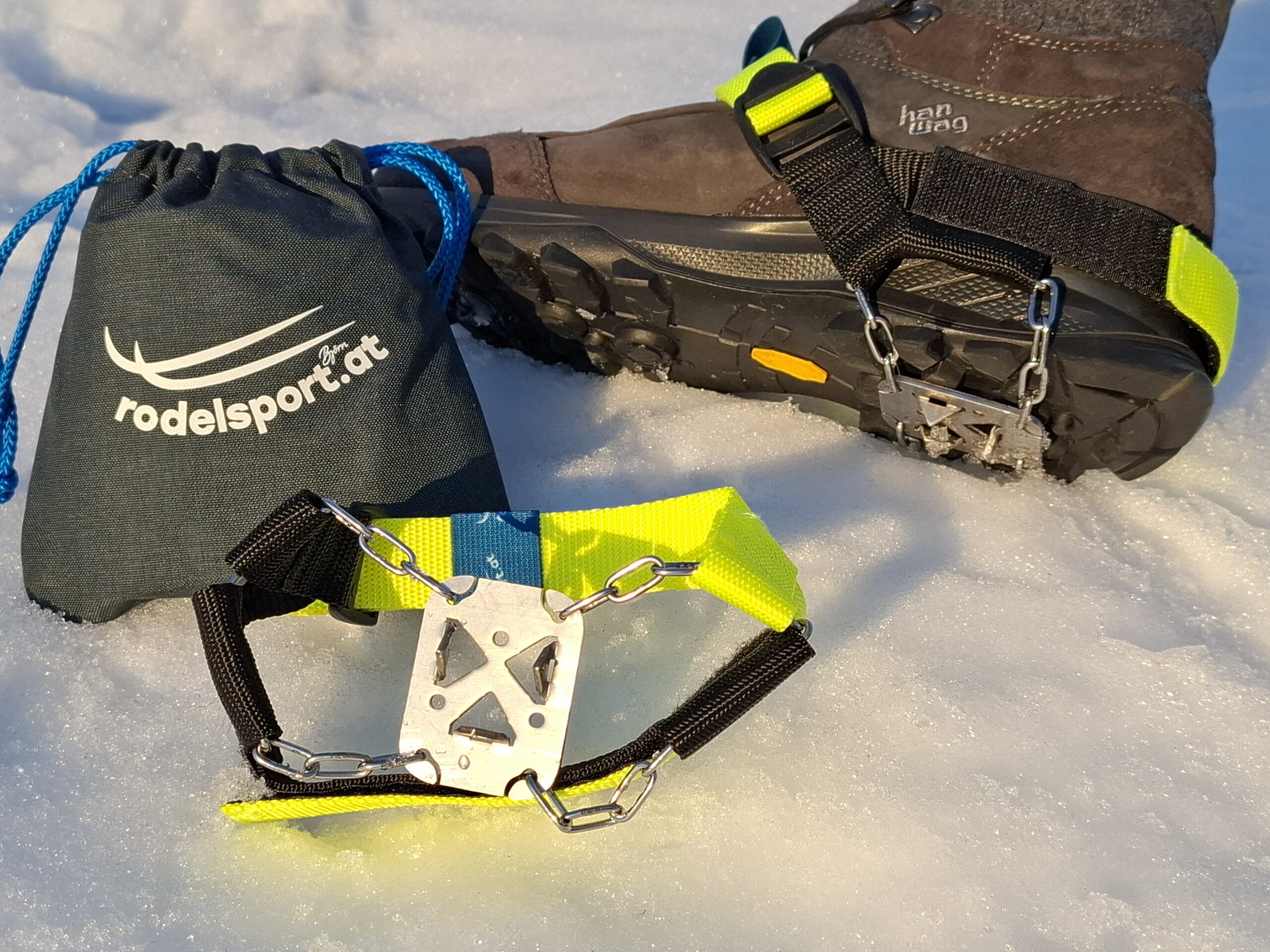 Lieferumfang: ein Paar Bremshilfen mit 5 Spikes, Befestigungsgurt, Klettband für Transportschutz, Aufbewahrungsbeutel, Bedienungsanleitung